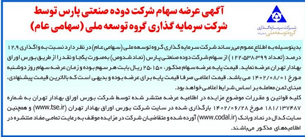 به گزارش روابط عمومی گروه توسعه ملی، شرکت سرمایه گذاری گروه توسعه ملی با انتشار آگهی، از عرضه سهام شرکت دوده صنعتی پارس خبر داد و اعلام کرد: بدینوسیله به اطلاع عموم می رساند شرکت سرمایه گذاری گروه توسعه ملی(سهام عام) در نظر دارد نسبت به واگذاری 12.9 درصد (تعداد 122538399) از سهام شرکت دوده صنعتی پارس (نماد شدوص) به صورت یکجا و نقد را از طریق بورس اوراق بهادار تهران عرضه نماید.