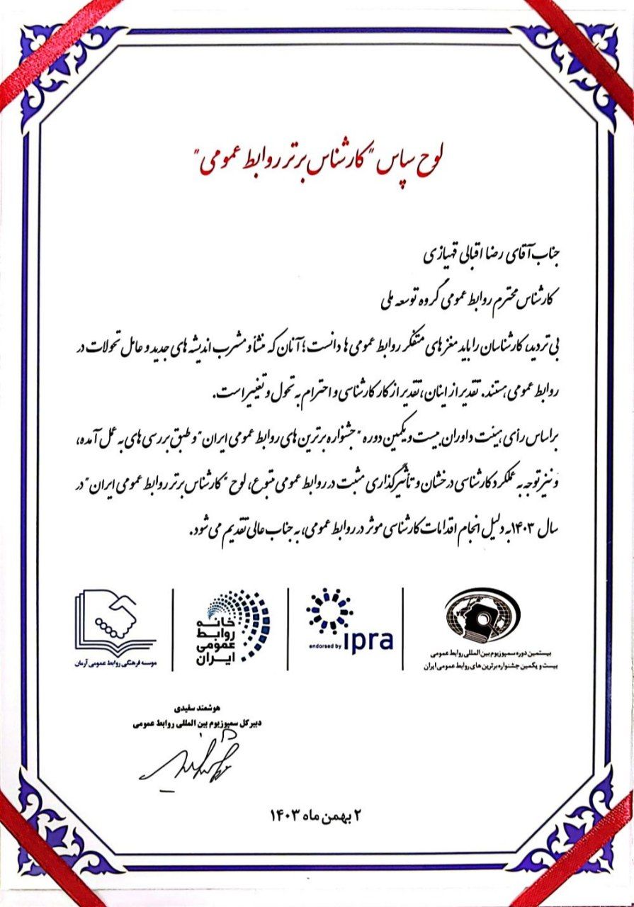 لوح سپاس کارشناس برتر روابط عمومی ایران براساس رای هئیت داوران بیست و یکیمن دوره جشنواره برترین های روابط عمومی ایران و با توجه به عملکرد کارشناسی موثر و مثبت رضا اقبالی اهداء شد .