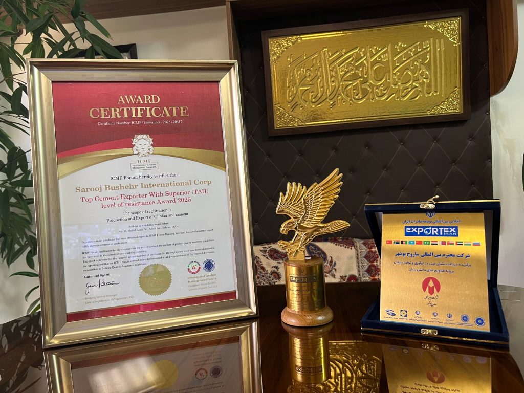 مهمترین این دستاوردها، دریافت لوح تقدیر و گواهینامه معتبر انجمن ICMF بود. بر اساس این گواهینامه، شرکت ساروج بوشهر بهعنوان «صادرکننده برتر سیمان با سطح مقاومت عالی (TAH) در سال ۲۰۲۵» معرفی شد. این عنوان معتبر پس از ارزیابیهای چندجانبه در زمینه کیفیت، پایداری و انطباق با استانداردهای تضمین کیفیت جهانی به این شرکت اعطا گردید.