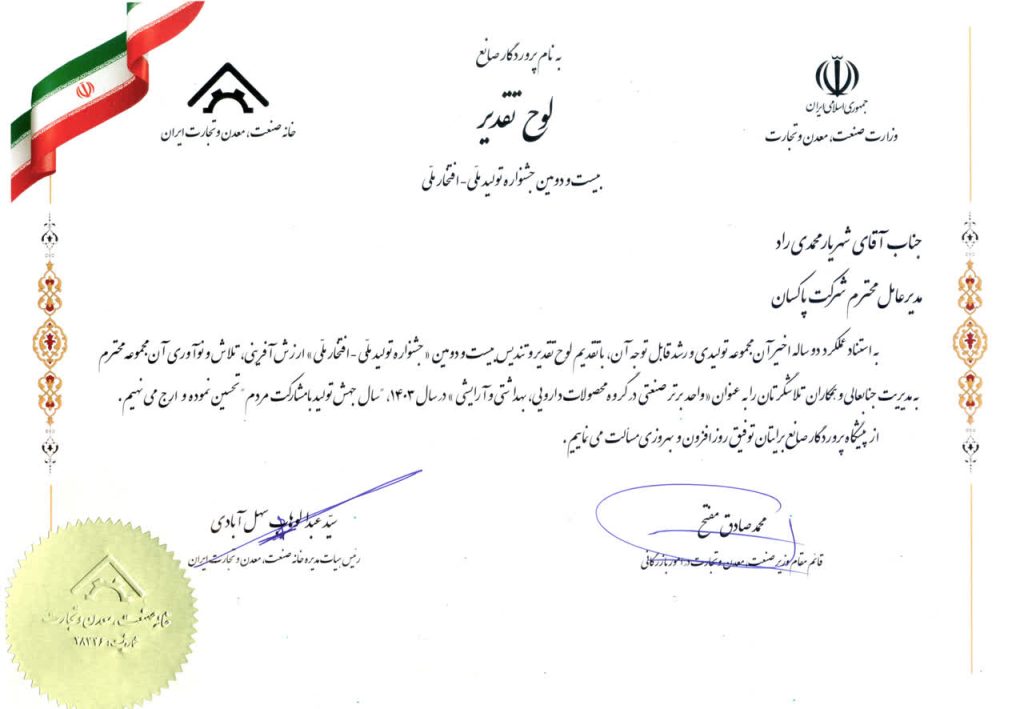 شرکت پاکسان در بیست و دومین جشنواره «تولید ملی، افتخار ملی» به عنوان واحد برتر صنعتی در گروه محصولات دارویی، بهداشتی و آرایشی معرفی شد و تندیس ارزشمند این رویداد را دریافت کرد.